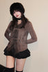 くすみブラウンのボア素材と、トグルボタンのコンビが絶妙に効いたトップス。胸元から裾までふわっと揺れるフェザーフリンジが、抜け感と華やかさをプラスします。甘すぎないラフさがありつつ、しっかり視線を惹きつける一枚です。ミニスカートやロングブーツでワンホンライクにまとめても、あえてダメージデニムで外してカジュアルダウンもおすすめです。